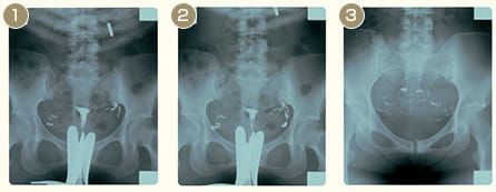 - 再びレントゲン撮影。造影剤がきちんと腹腔内で拡散していれば異常なし
